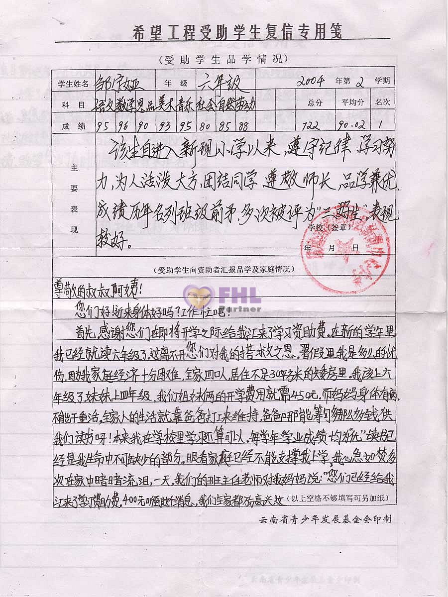 我的妈妈是去年死去的, 不幸的是今年5月父亲又去世 了, 只剩下70多岁的老祖母。 全家不能生活。 我只好去大舅家。 。。。你们支持我的钱已经收到。 我会加倍努力学习, 不辜负你们的希望。